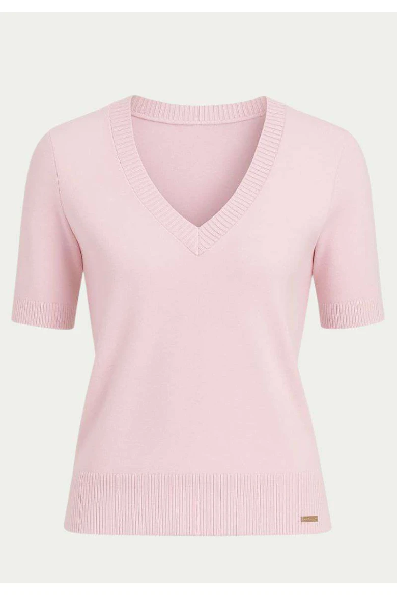 Blusa em Tricot com Decote V e Mangas Curtas - Rosa bebê