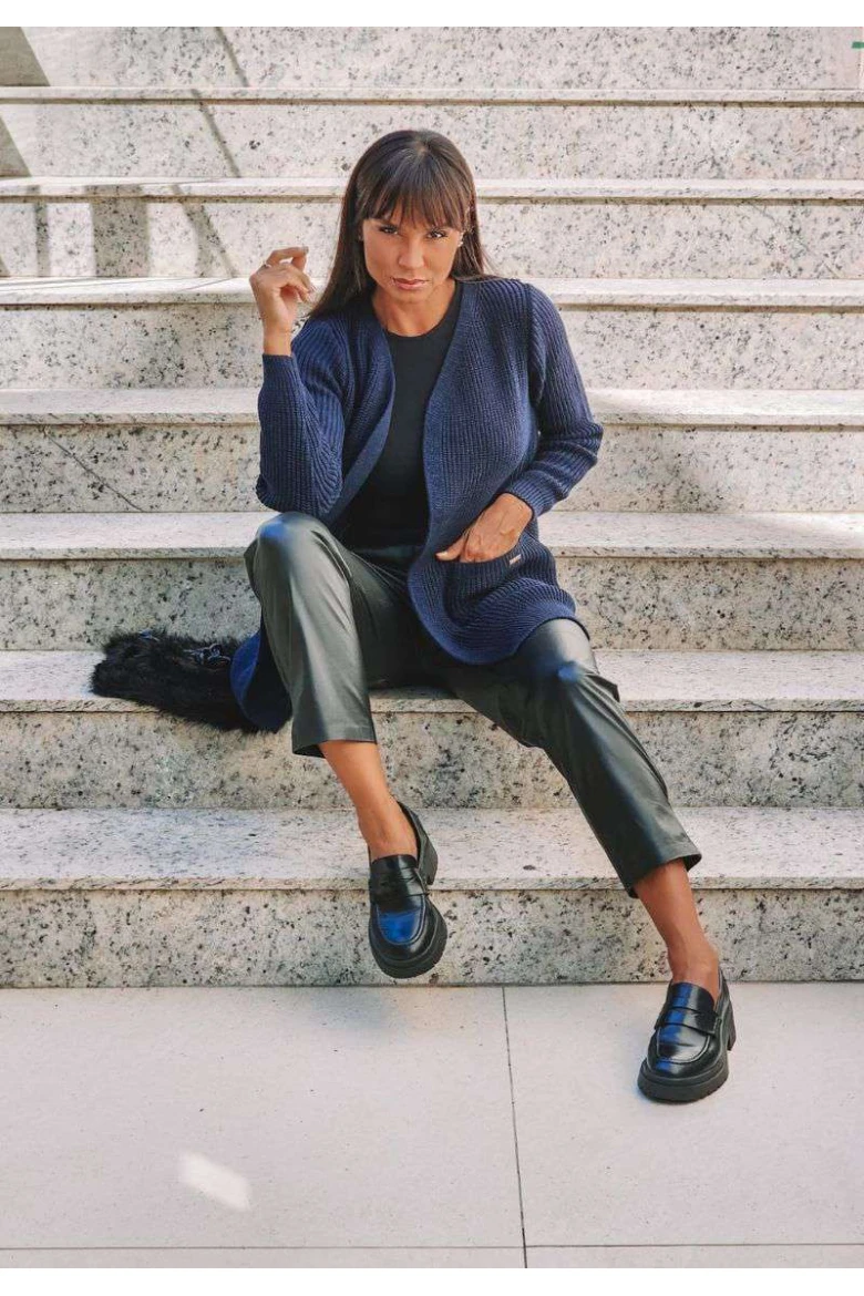 Cardigan Alongado Feminino em Tricot com Bolsos Frontais - Azul naval