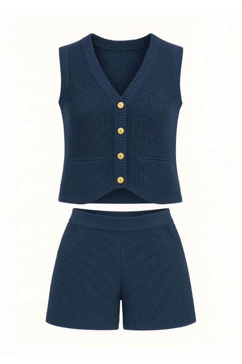 Conjunto em Tricô Feminino com Colete de Botões e Shorts - Marinho